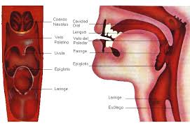 La faringe està situada a la part posterior de la boca i és comuna a les vies digestives i respiratòries. Al sostre de la faringe ens trobem amb unes estructures glandulars limfàtiques, les amígdales, amb funció defensiva front a les infeccions bacterianes. Durant la deglució, el pas de l’aire a la laringe resta tancat momentàniament per l’epiglotis, estructura cartilaginosa elàstica de la laringe. Això evitarà l’entrada de substàncies sòlides o líquides a les vies respiratòries.